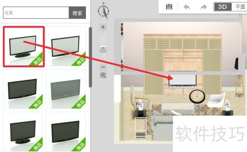 18、 从左侧素材库的家电-电视分类中,选取电视素材,拖入柜子,调整离地高度和位置即可完成操作。