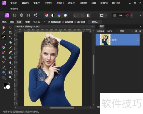 1、 在Affinity Photo中打开人像图片,用调整边缘功能选中主体,背景会变为透明,效果。