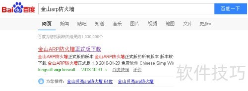 5、 先在网络搜索金山ARP防火墙,找到可信的下载链接,获取安装包并完成下载。