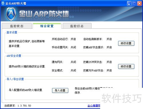 8、 安装完成后重启电脑,金山ARP防火墙将自动运行。在中开启防火墙服务,还可导入备份的ARP设置。