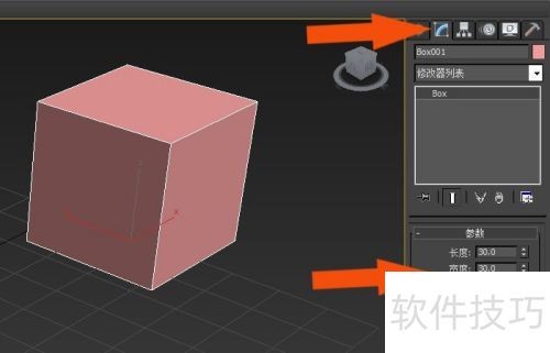 8、 随后,左键点击模型修改面板,通过键盘输入长方体尺寸,将模型调整为正方体,。
