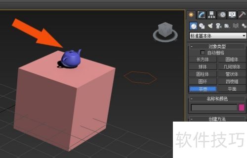 12、 接着,创建茶壶模型,点击移动按钮,将茶壶置于柱状正方体模型上方,所示。