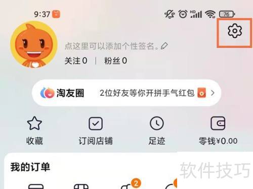 1、 打开淘宝APP,进入我的淘宝,点击右上角设置图标。