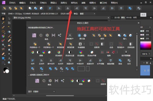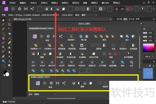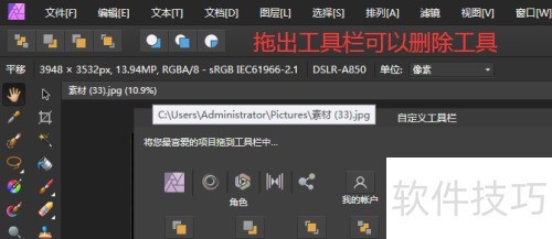 、 打开自定义工具对话框,把原工具栏工具拖出就能删除,所示。
