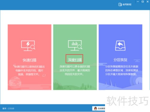 4、 打开下载的软件,可选择其功能查找回收站数据。软件提供三个功能选项,均能扫描文件。若针对特定文件扫描,可选择深度扫描功能以获得更详细的结果。