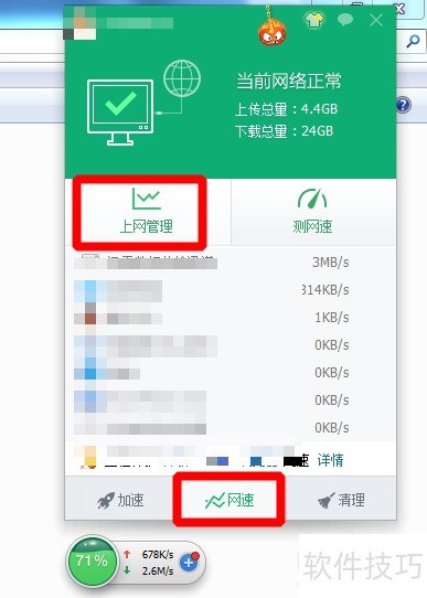 2、 先点击网速,再点击上网管理: