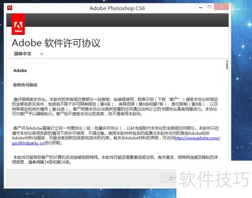 1、 首先要安装已下载好的Photoshop cs6。网上有许多该安装包,大家可自行网络下载,也能到Adobe官网下载。下载完成后解压,点击其中的setup.exe开始安装,会弹出对话框,点击忽略后就会进入安装流程。要特别注意,安装时需全程断网。