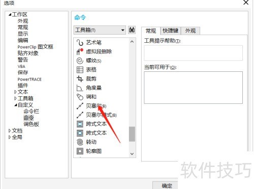 7、 在命令中选择工具箱,下拉右侧滑键,找到并点击贝塞尔。