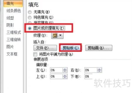 选中已组合的形状,右键点击并选择设置形状格式,在弹出的对话框中依次选择图片或纹理填充中的剪贴板选项,完成后点击关闭按钮,返回主界面即可。