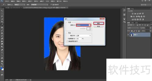 2、 在工具箱选取魔棒工具,点击背景。前往编辑菜单,选择填充,弹出填充窗口后,选择前景色选项,点击确定。在选择菜单中点击取消选择(Ctrl+D),完成操作。