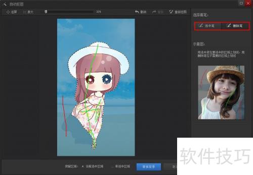 5、 第四步:利用右侧的选中笔和删除笔,选取图片中需要保留的部分。