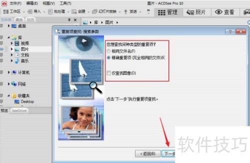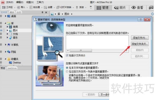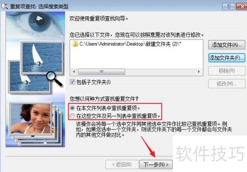 5、 接下来要确定acdsee查找重复文件的方式,默认是在所选文件夹内查找,另一种是将所选文件夹中的文件与其他文件夹对比,选择一种方式后点击下一步即可。