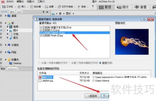 6、 acdsee很快就完成去重查找,我们在其界面选择重复项合集,于下方选定要删的重复文件,最后点击下一步。