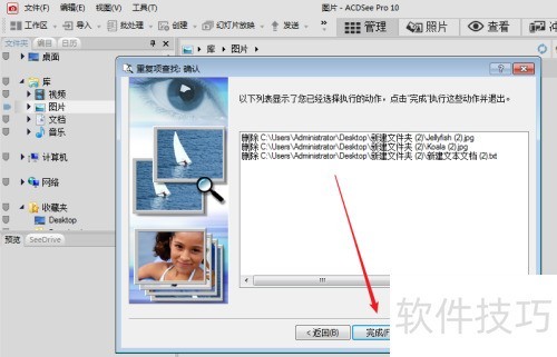 8、 ACDSee会提示选择要删除的文件,大家务必仔细查看,避免误删重要文件,确认无误后点击完成即可。以上就是ACDSee去重的方法,快去删除多余的重复文件吧。