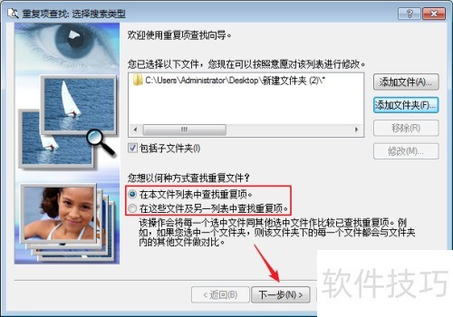 5、 接下来选择acdsee查找重复文件的方式。默认是在选定文件夹内查找,下方选项是将该文件夹中的文件与其他文件夹对比。选择其中一种方式后,点击下一步继续操作。