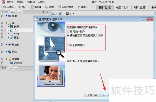 6、 我们需要在acdsee中选择查找的重复项类型,如相同文件名或精准重复项(通常选此项)。还可决定是否仅查找图像,最后点击下一步继续操作。