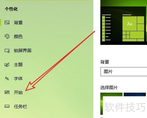 11、 接着,在打开的个性化页面中,点击开始菜单选项。