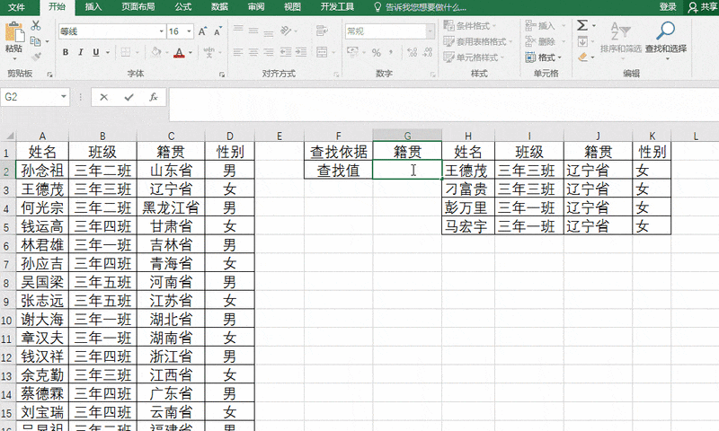 在G2单元格中输入需查找的信息。