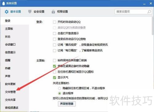 5、 此时会弹出QQ系统设置窗口,点击左侧文件管理菜单选项。