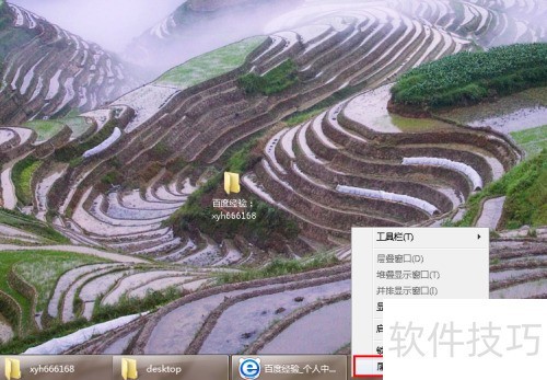 2、 在任务栏上右击,打开菜单,选择底部的属性选项。