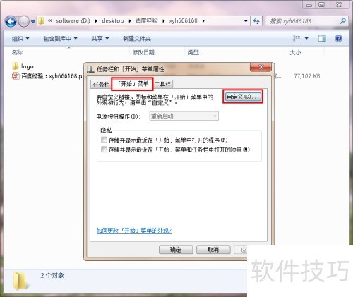 3、 单击打开属性菜单,随后会弹出任务栏和开始菜单属性设置对话框。在上方选项卡中选择开始菜单,进入后点击自定义按钮,即可进行相关设置调整。