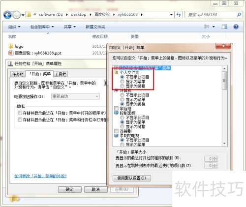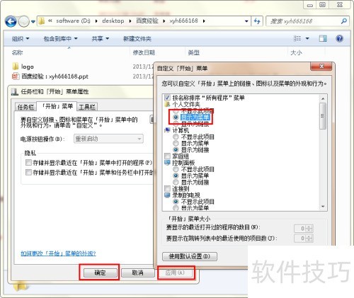 5、 在自定义开始菜单的列表里找到个人文件夹选项,将其状态设为显示为菜单或显示为链接。随后点击确定按钮,并在任务栏和开始菜单属性对话框中依次点击应用与确定按钮完成设置。
