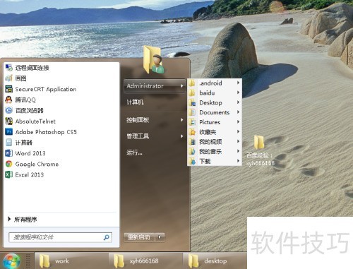 6、 接着打开开始菜单,检查个人文件夹是否已成功添加。小编在装系统时用的是默认的Administrator账户,现在开始菜单中已显示该文件夹的快捷方式,可直接打开。