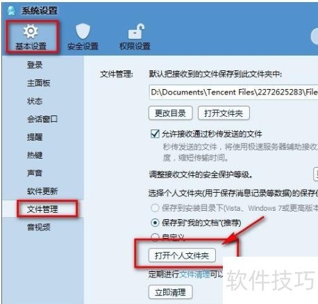 1、 腾讯QQ个人文件夹的存放位置:打开系统设置查看。