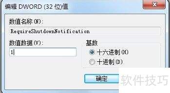 7、 双击RequireShutdownNotification键值,把数值数据从0改为1,点击确定保存,然后退出注册表编辑器。