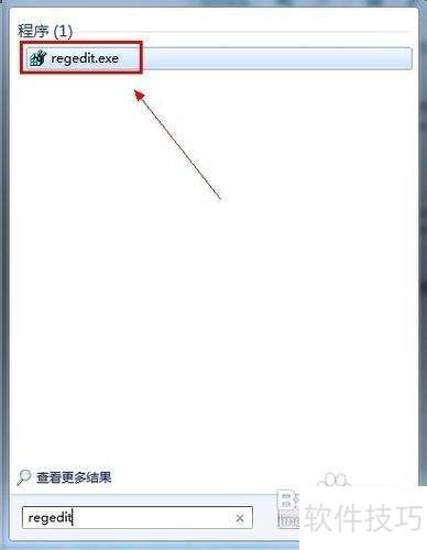 3、 点击开始按钮,于搜索程序和文件框输入regedit命令,查找后点击程序里的regedit.exe。