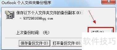 10、 弹出Outlook个人文件夹备份程序对话框,点击选项命令即可设置备份。