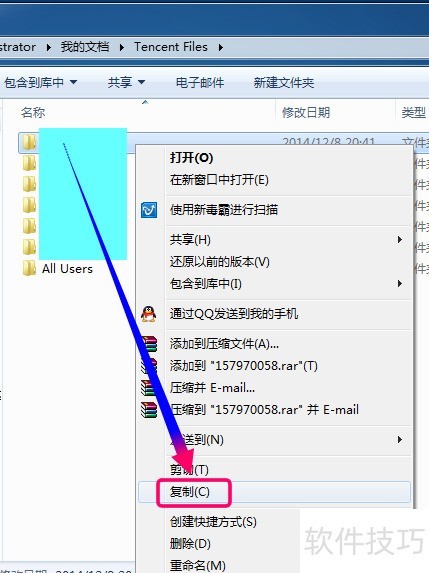 6、 右键点击用QQ号码命名的文件夹,然后选择复制选项。