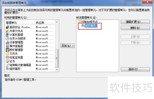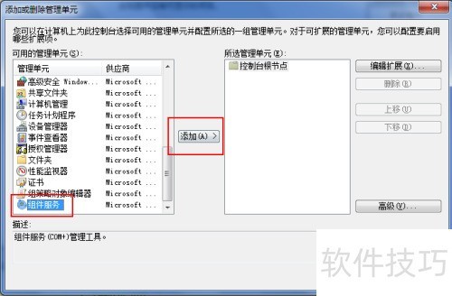 4、 在左侧可用的管理单元中,把滚动条拉至底部,单击组件服务,再点击中间添加按钮。