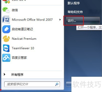 1、 首先,点击开始菜单,选择运行,打开运行对话框。
