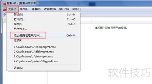 3、 在控制台的根节点对话框中,依次点击文件、添加/删除管理单元,以打开对应对话框。