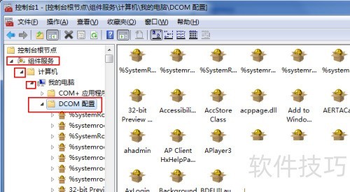 6、 在控制台根节点下找到组件服务,点击小三角展开,依次查找并定位到DCOM配置。