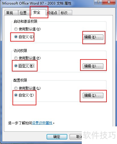 9、 接着点击安全选项,把下方三个权限设为自定义,逐一点击编辑,添加everyone权限。