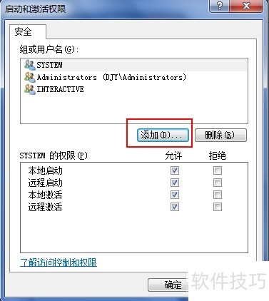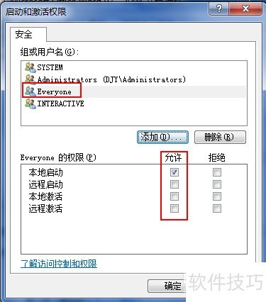 13、 在启动和激活权限对话框里,会出现everyone组或用户名。选中下方的everyone,将其所有权限设为允许,最后点击确定完成设置。