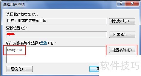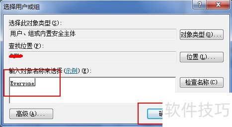 11、 随后会弹出选择用户和组的对话框,在输入对象名称的位置填入everyone,然后点击检查名称按钮。