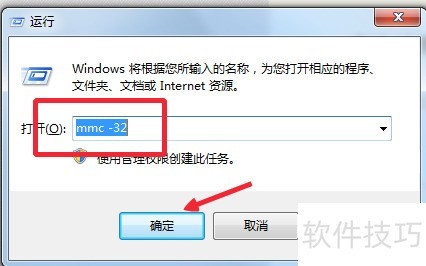 2、 在运行对话框输入mmc -32(注意:mmc与横杠间有空格),点击确定,即可打开控制台。