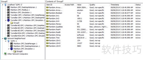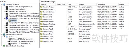 10、 在OPC-2的OPC Explorer中,可发现两种连接至OPC-1 simulation服务器OPC组的方式。这两种方式下的OPC项质量均为良好状态。这表明连接与数据传输均正常工作。
