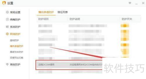 6、 请看图。进入网络防护中的横向渗透防护页面,把远程DCOM调用的防护开关开启即可。