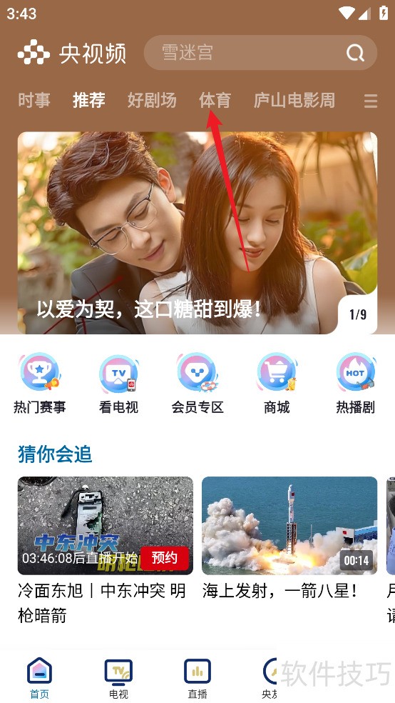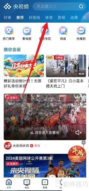 1、 打开央视频APP,在首页上方点击【体育】选项。
