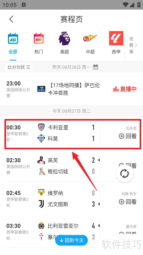2、 第二步:在赛程页,找到意甲联赛第2轮卡利亚里VS科莫,点击【回看】