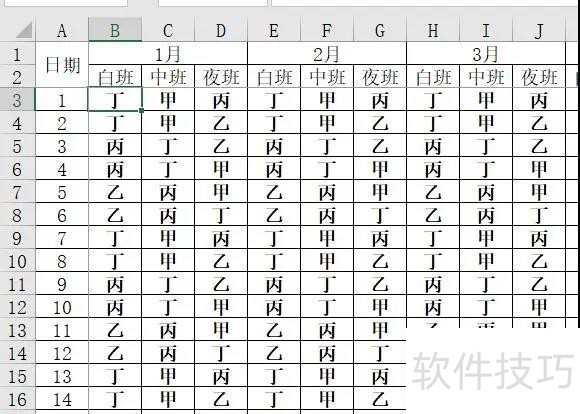 1、 从数据图中很容易看出很有规律,A列是日期,从1开始到31日结束(不要纠结2月31号)第一行是月,每月占三列,分别是 三个班次,第二行就是班次了!白班(8点-16点)中班(16点-24点)夜班(0点-8班)