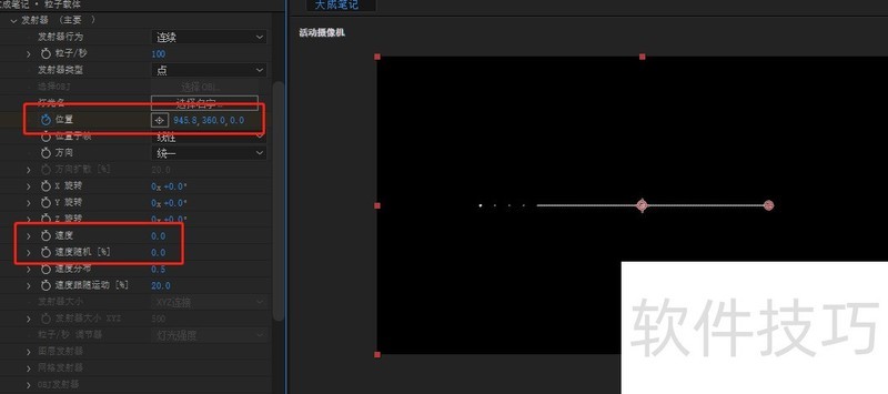 2、 效果控件面板-发射器-修改速度和速度跟随属性值为0,制作位置在x轴上动画,成为一条光线