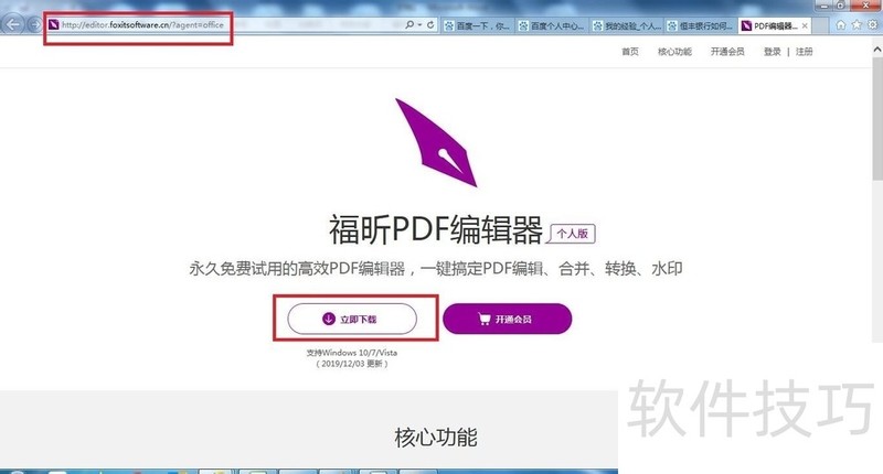 1、 在IE浏览器搜索栏输入“福昕PDF编辑器”,找到“福昕PDF编辑器”下载页面;