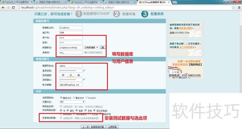 6、 下一步,填写数据库配置和用户信息。若要安装测试数据注意勾选相应选项。