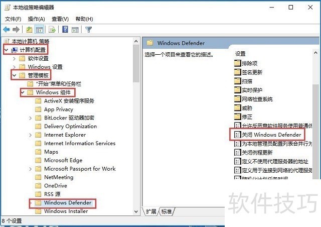 2、 在打开的”本地组策略编辑器“界面中,依次展开”计算机配置→管理模板→Windows组件→Windows Defender“, 可以看到右侧窗口中的”关闭Windows Defender“选项