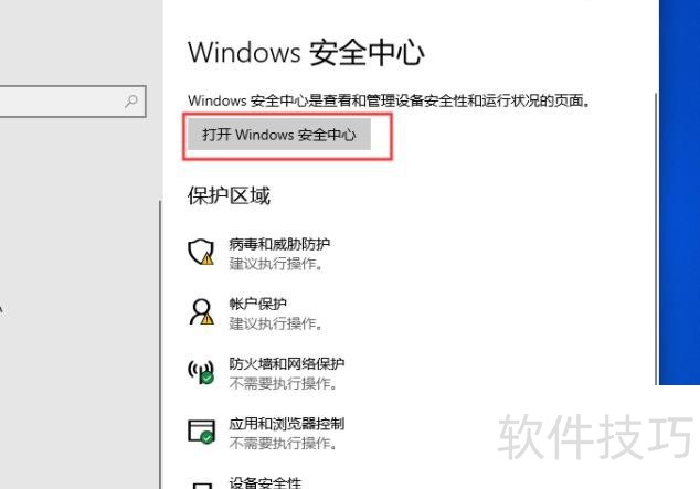 4、 在右侧栏目中选取打开Windows安全中心,如图所示: